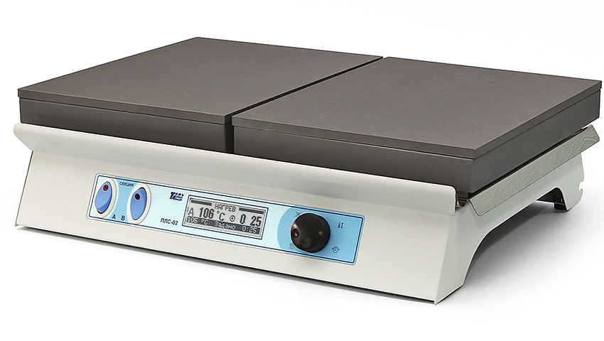 Плита нагревательная лабораторная секционная ПЛС-02 имеет две секции нагрева. Каждая секция нагрева может работать отдельно или совместно. При совместной работе секций температура разогрева одинакова по всей нагревательной поверхности обеих секций.